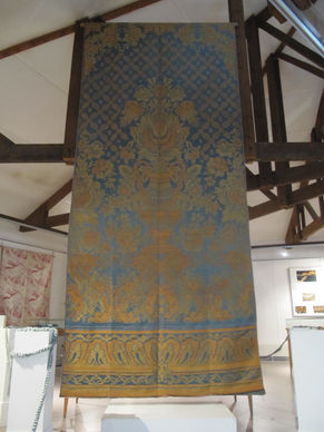 Les étoffes devant impérativement être protégées du soleil, de la lune et surtout des flashs, il était impératif de les placer dans l’espace le plus sombre et face aux personnes assurant la surveillance. De gauche à droite, le visiteur peut d’abord découvrir les différentes sortes d’étoffes, ce qui est aisé compte tenu de la variété des collections de l’association. Damas, damas dentelles, moires, brochés, velours ciselés, impression chaîne, c’est un inventaire de la création technique et esthétique tourangelle qui est représentée avec pour point culminant la tenture de l’hôtel de ville et les rideaux de l’exposition de Saint Louis du Missouri.